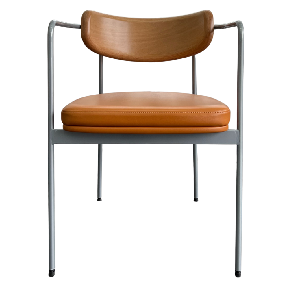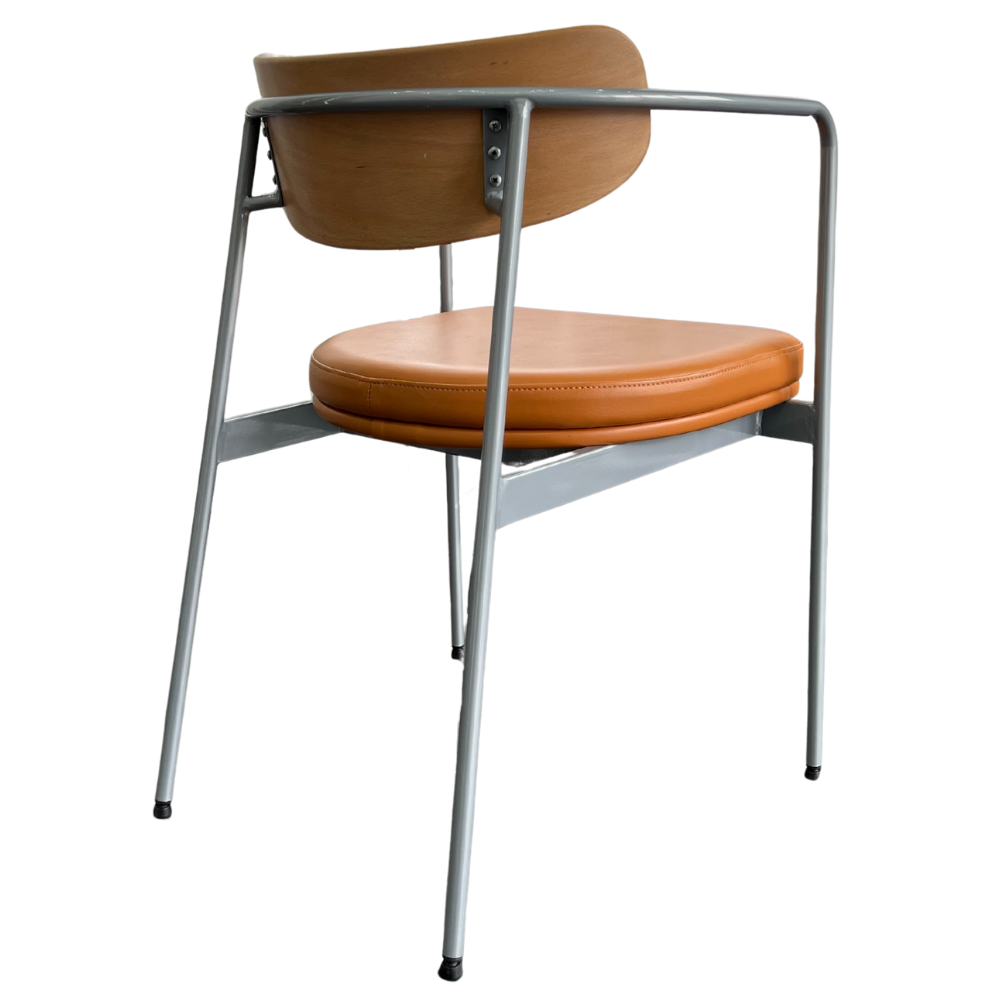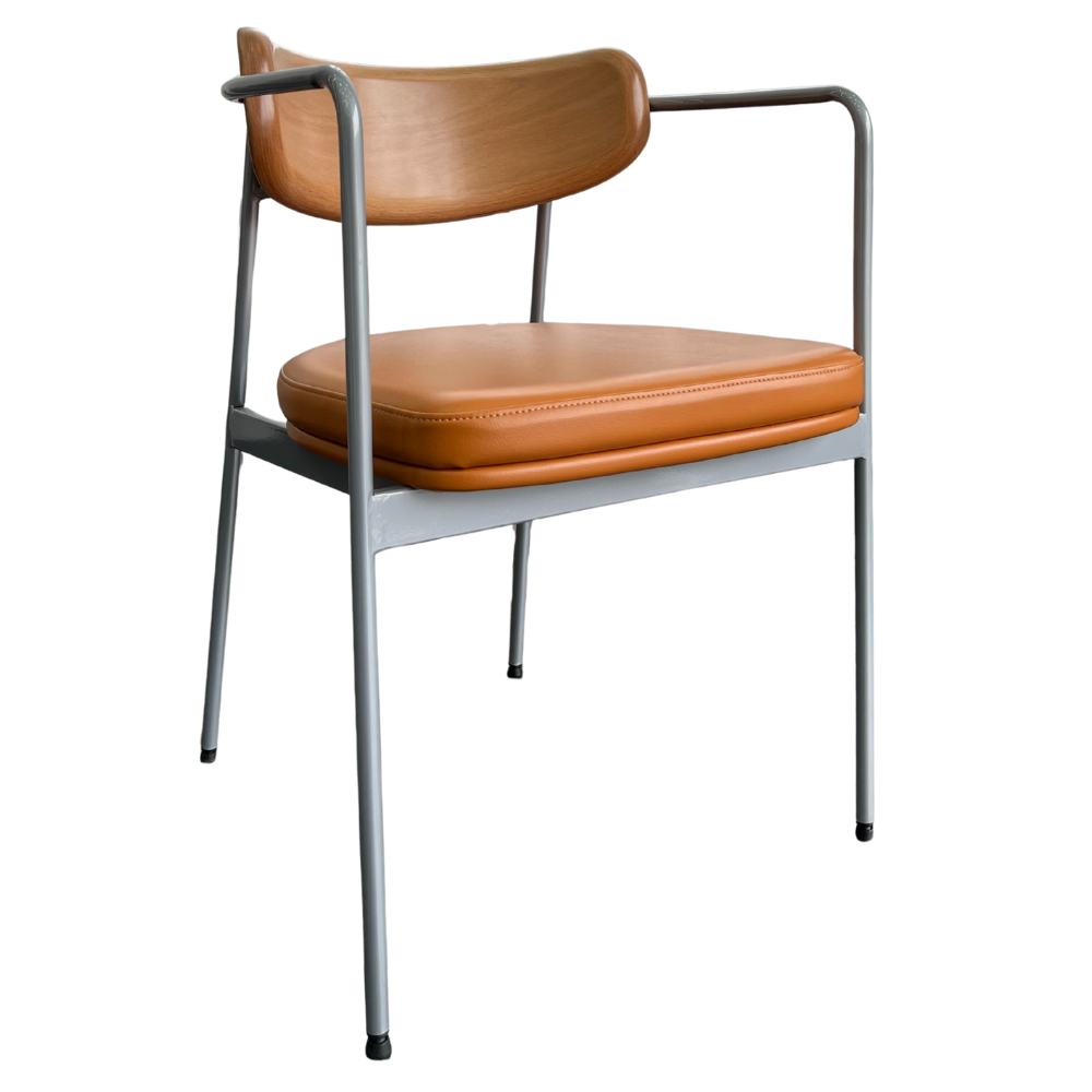 Der Stuhl Bristol mit Armlehnen bietet zusätzlichen Komfort und eine elegante Optik. Die Rückenlehne aus Sperrholz mit HPL-Beschichtung wird durch einen cognacfarbenen PU-Polstersitz ergänzt. Das silberfarbene Metallgestell mit Pulverbeschichtung sorgt für Stabilität und macht den Stuhl ideal für Restaurants, Cafés und Lounges.