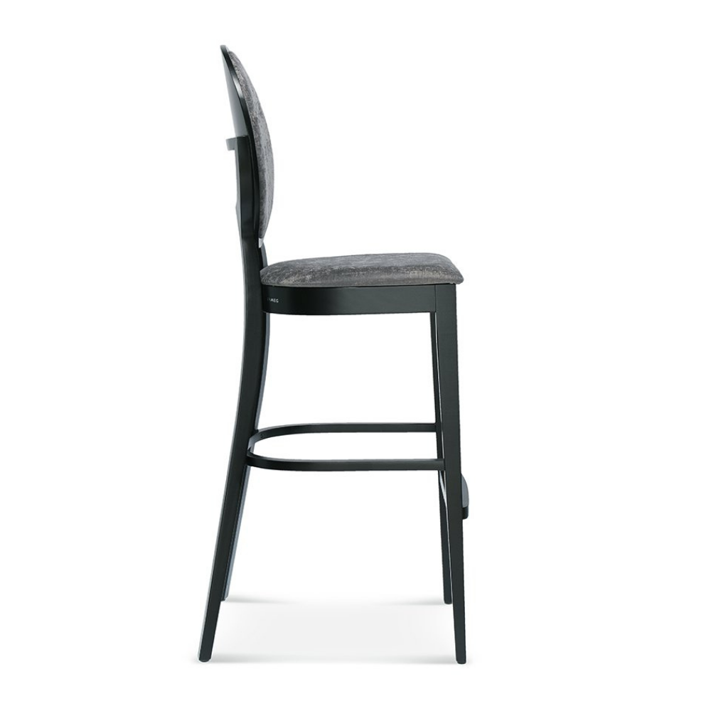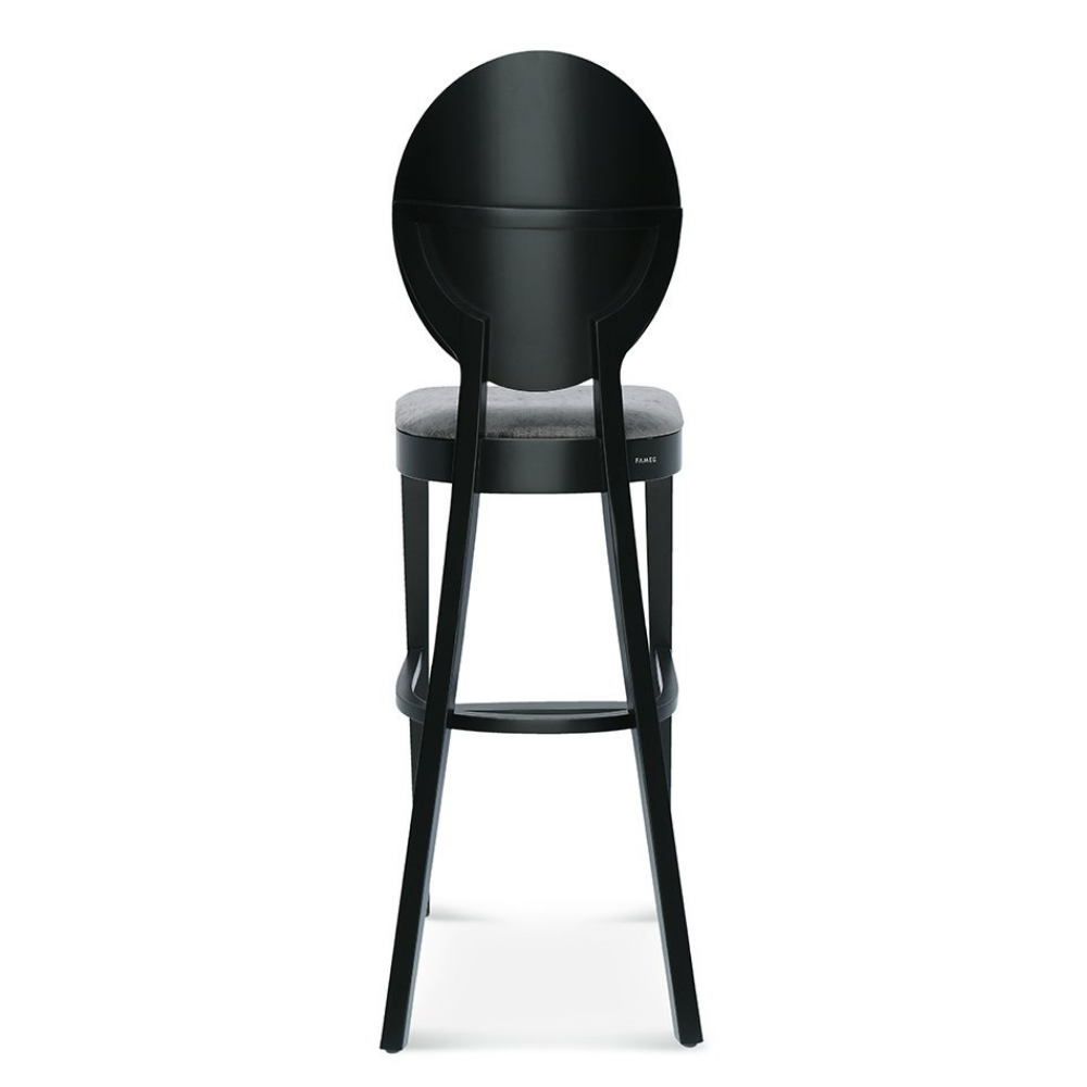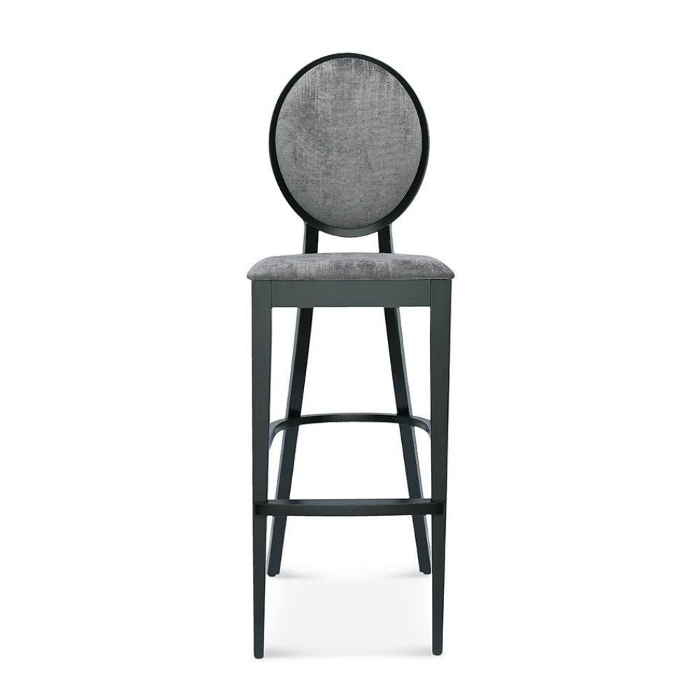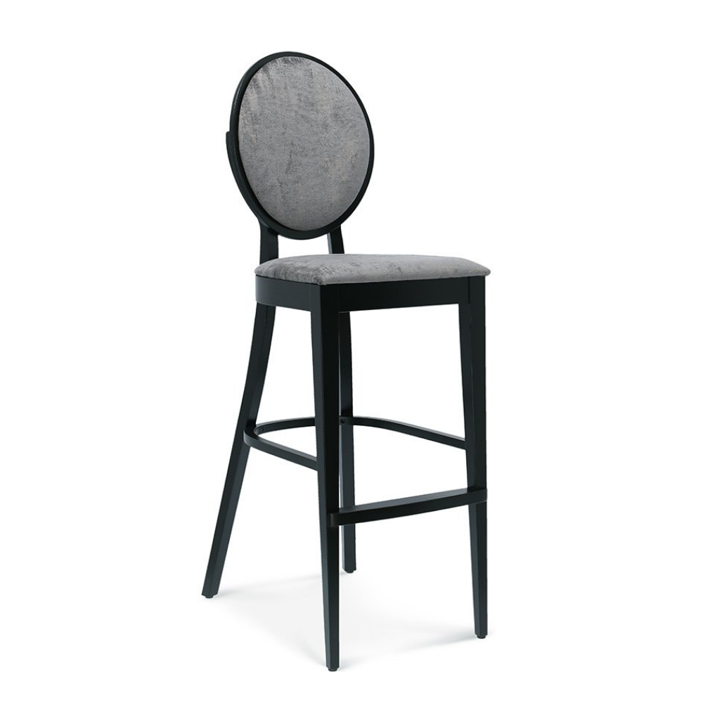 Der Premium Barhocker Diana verbindet klassische Eleganz mit hohem Sitzkomfort. Die runde, hohe Rückenlehne und der gepolsterte Sitz setzen ein stilvolles Statement – ideal für Restaurants, Bars und Hotels.
