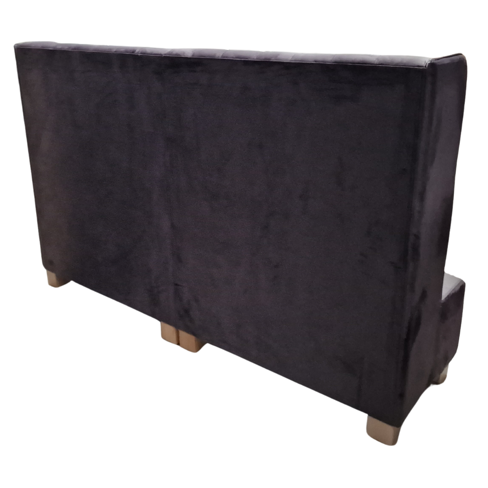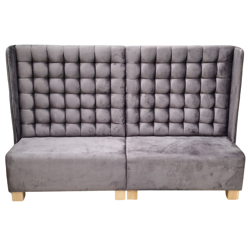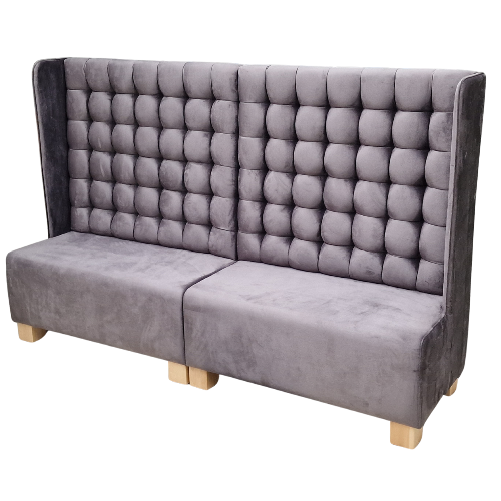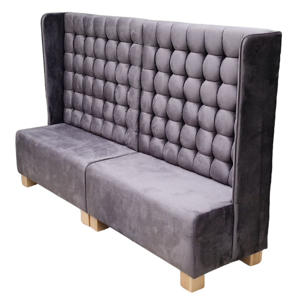 Diese Sitzbank mit hoher Rückenlehne überzeugt durch ihre großzügige Polsterung und das elegante Design – ideal für Restaurants, Lounges oder Wartebereiche. Der weiche Samtstoff in Grau (FRESH-38) und die markante Knopfheftung sorgen für eine stilvolle und komfortable Atmosphäre.