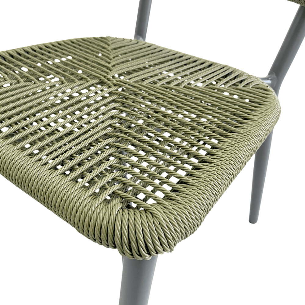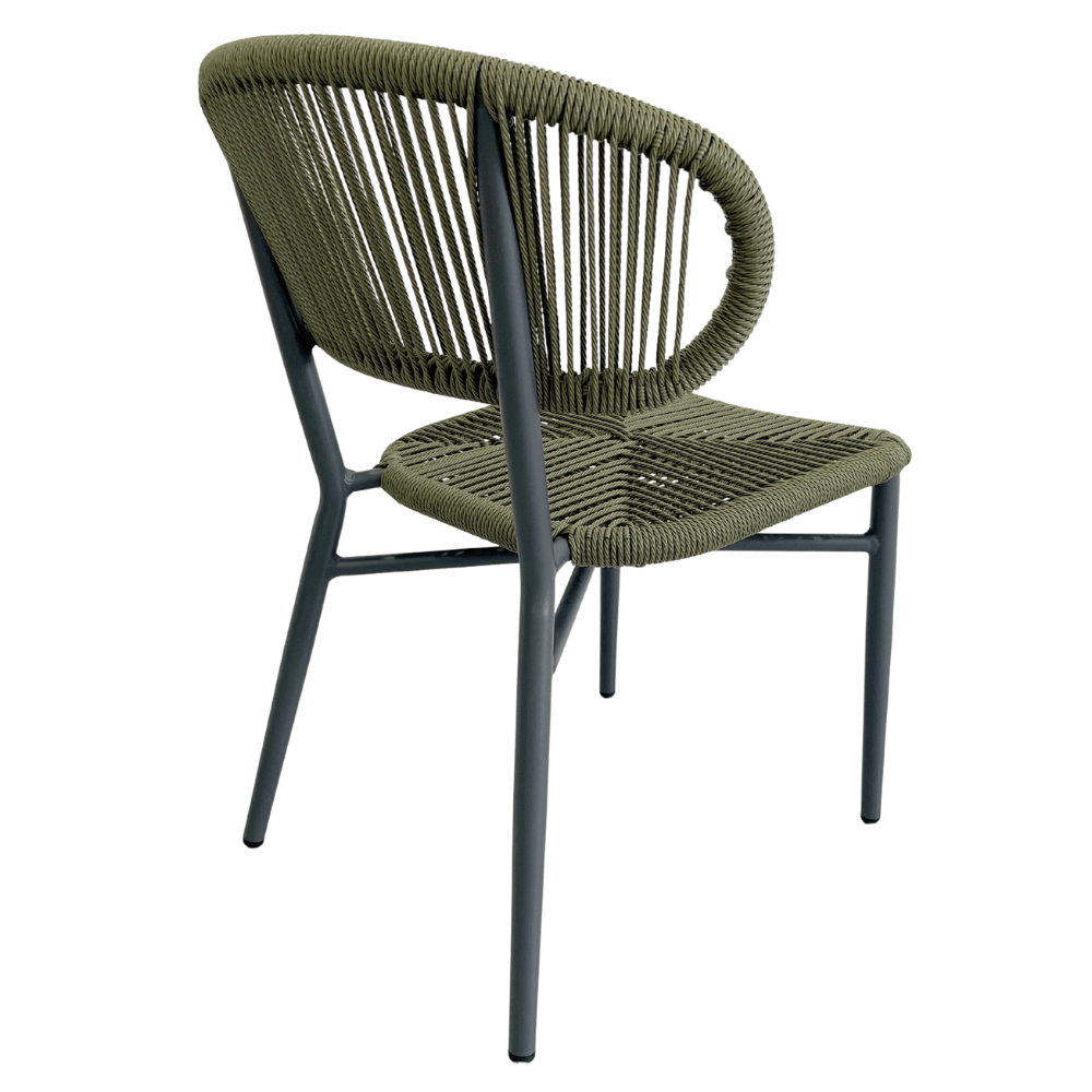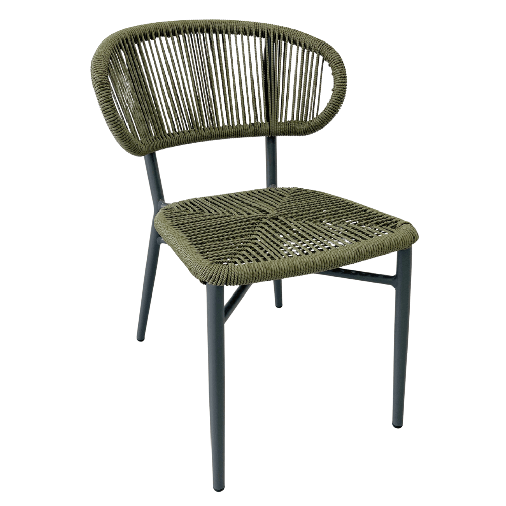 Der Terrassenstuhl Riva Opal Grün ist ein stapelbarer Gastro- und Caféstuhl aus Aluminium mit rund geflochtenem PE-Rattan – leicht, robust und pflegeleicht für den Outdoor-Einsatz.