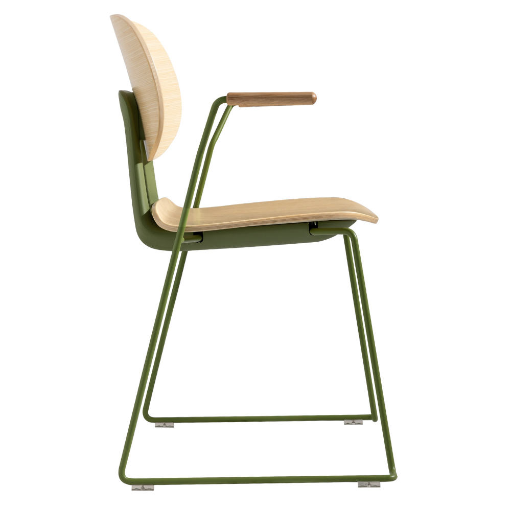 Der Stuhl York 2 mit Armlehnen kombiniert modernes Design mit zusätzlichem Komfort. Der Sitz aus Sperrholz mit Birkenfurnier wird durch ein stabiles Metallgestell mit Pulverbeschichtung ergänzt. Die Ausführung in Olivegrün setzt frische Akzente und eignet sich ideal für Restaurants, Cafés oder Kantinen.