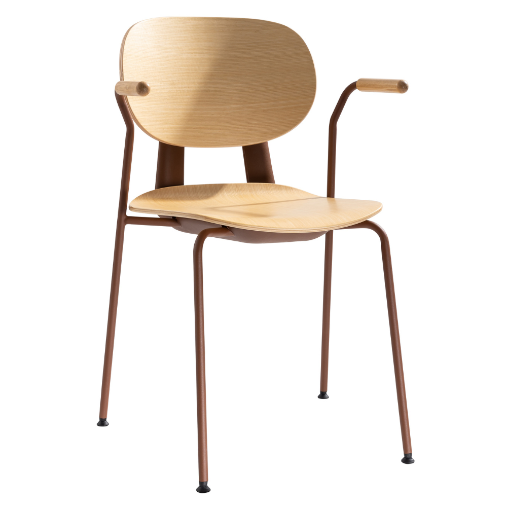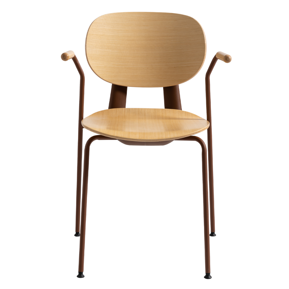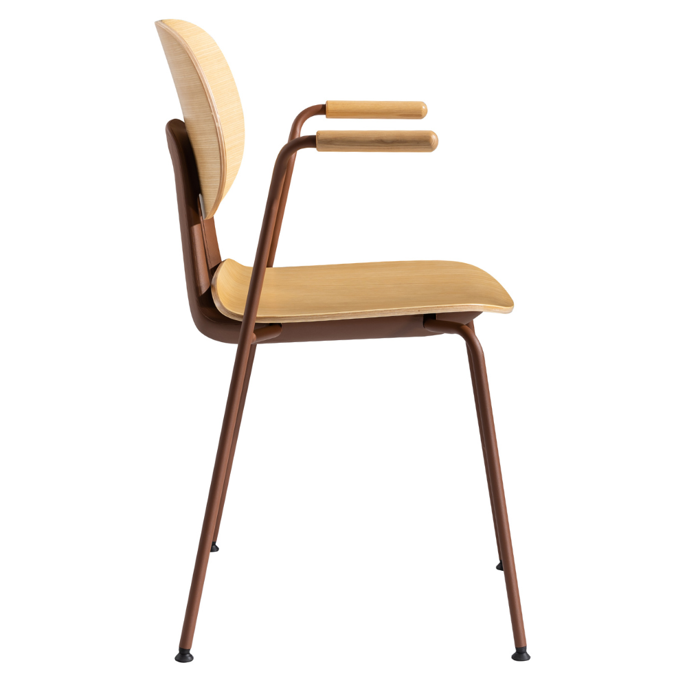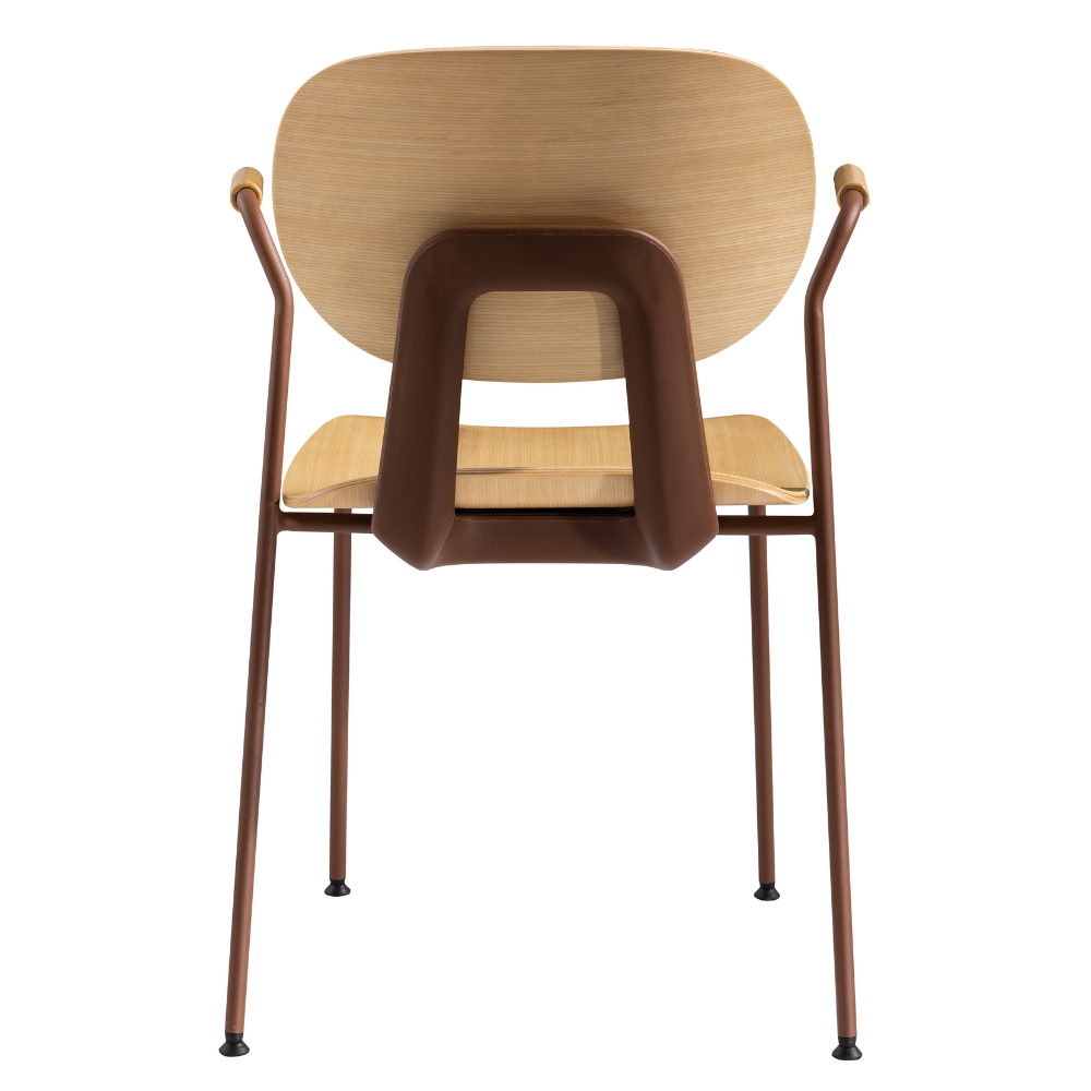 Der Stuhl York mit Armlehnen verbindet zeitlose Eleganz mit hoher Funktionalität. Der Sitz aus Sperrholz mit Birkenfurnier wird durch ein stabiles Metallgestell mit Pulverbeschichtung ergänzt. In Kupferbraun bringt der Stuhl warme Akzente in Restaurants, Cafés oder Kantinen.