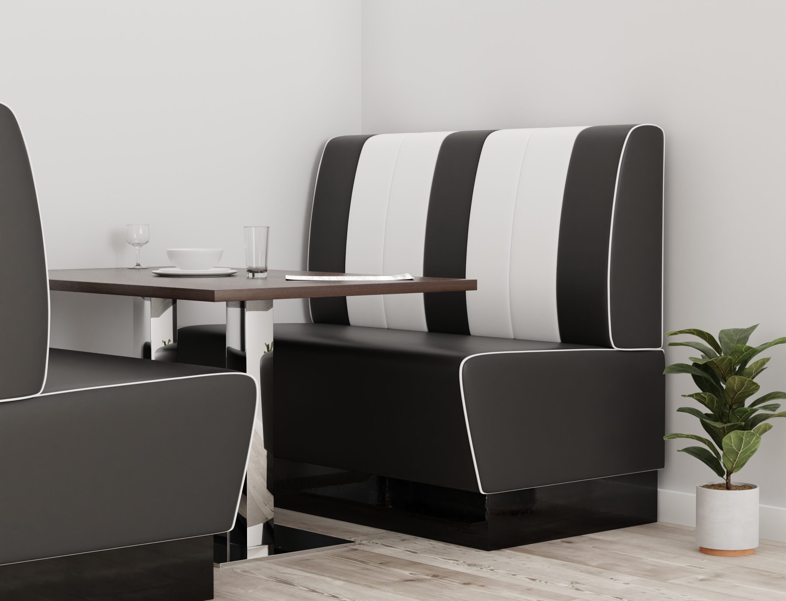 Die Americano Retro Sitzbank in Schwarz & Weiß bringt echtes Diner-Feeling in Ihre Gastronomie. Mit ihrer markanten Farbgebung, der klassischen Steppung und der bequemen Polsterung ist sie ideal für Burgerläden, Cafés, Restaurants oder Lounges. Der massive Sockel und die strapazierfähigen Materialien sorgen für Stabilität und Langlebigkeit im täglichen Einsatz.