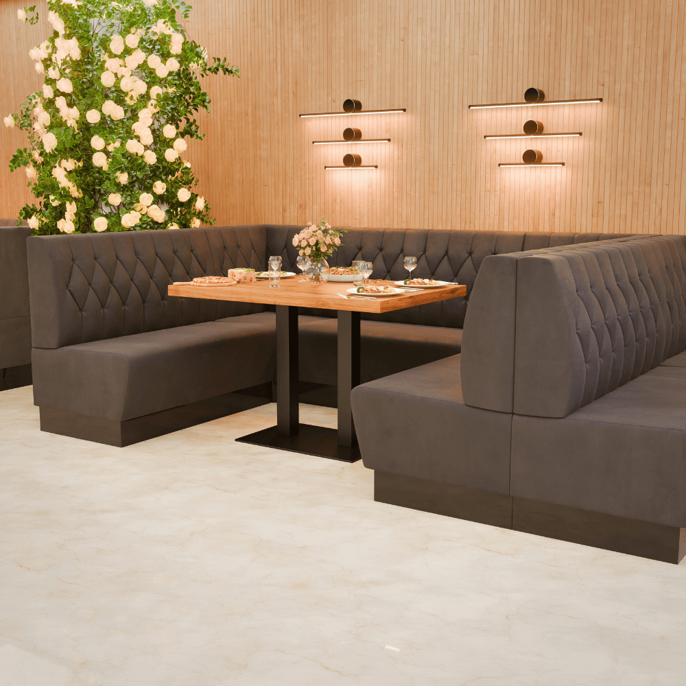Die Gastro Sitzbank Amsterdam ist die bequeme Dinerbank für Restaurants, Cafés und Hotels – robust, pflegeleicht und ideal für stark frequentierte Gastronomie.