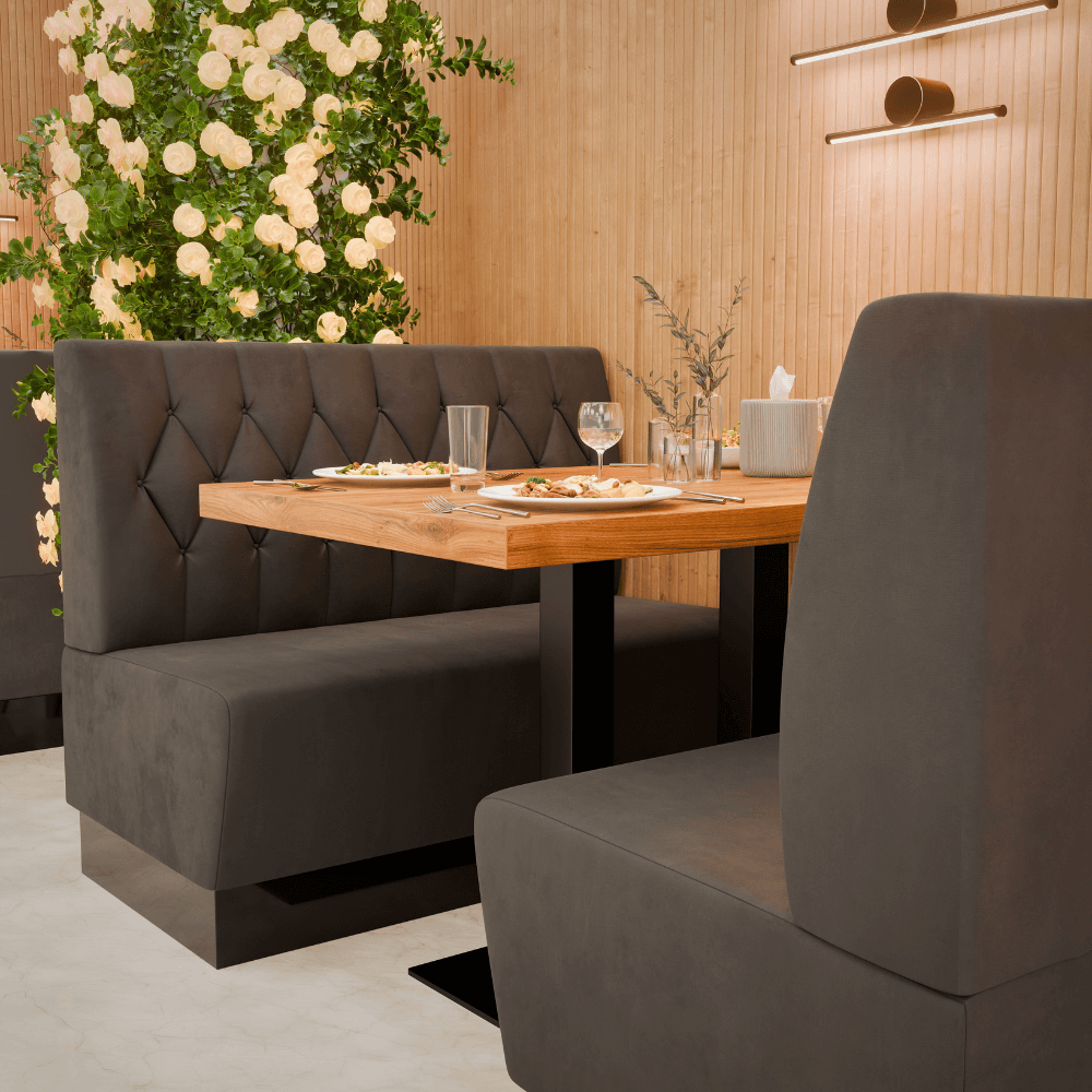 Die Gastro Sitzbank Amsterdam ist die bequeme Dinerbank für Restaurants, Cafés und Hotels – robust, pflegeleicht und ideal für stark frequentierte Gastronomie.