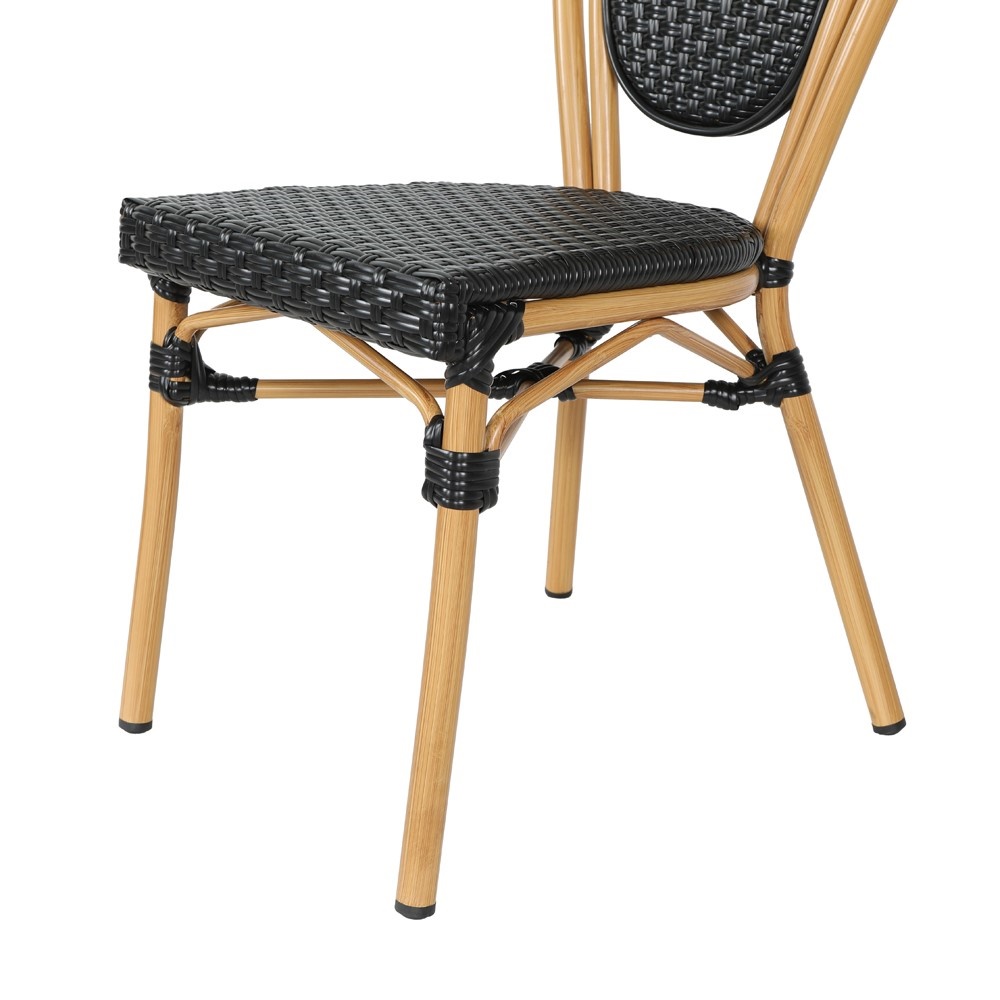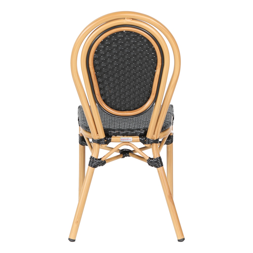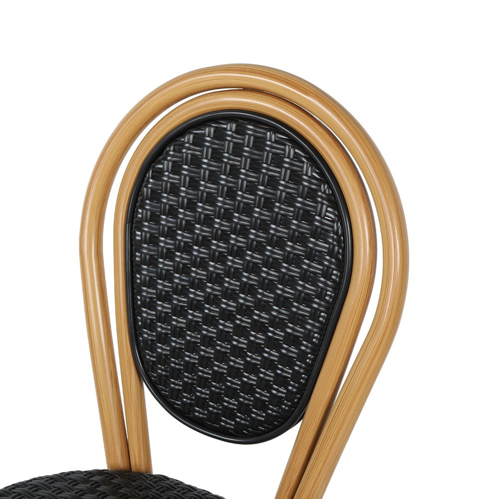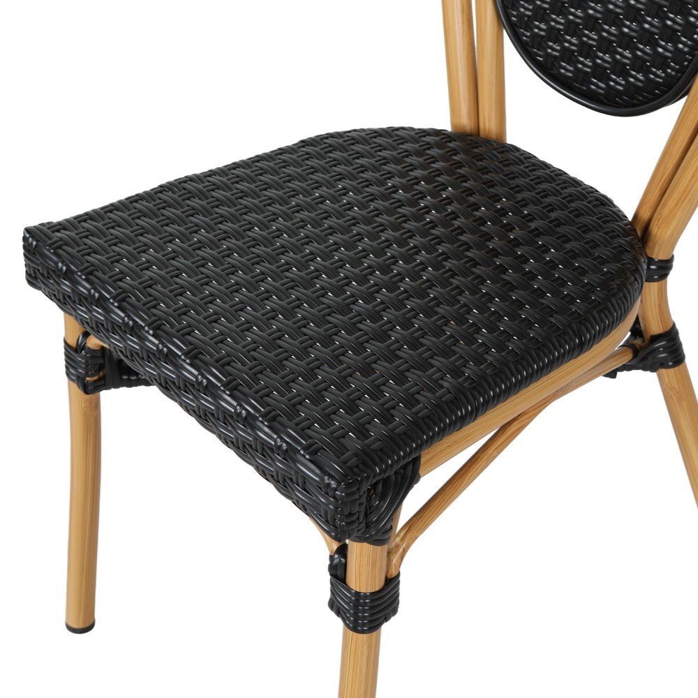 Das Gestell besteht aus hochwertigem Aluminium mit eleganter Bambusoptik, das nicht nur optisch beeindruckt, sondern auch leicht und rostfrei ist. Die Sitz- und Rückenfläche aus schwarzem Kunststoffgeflecht ist UV-beständig. Pflegeleicht und äußerst komfortabel.