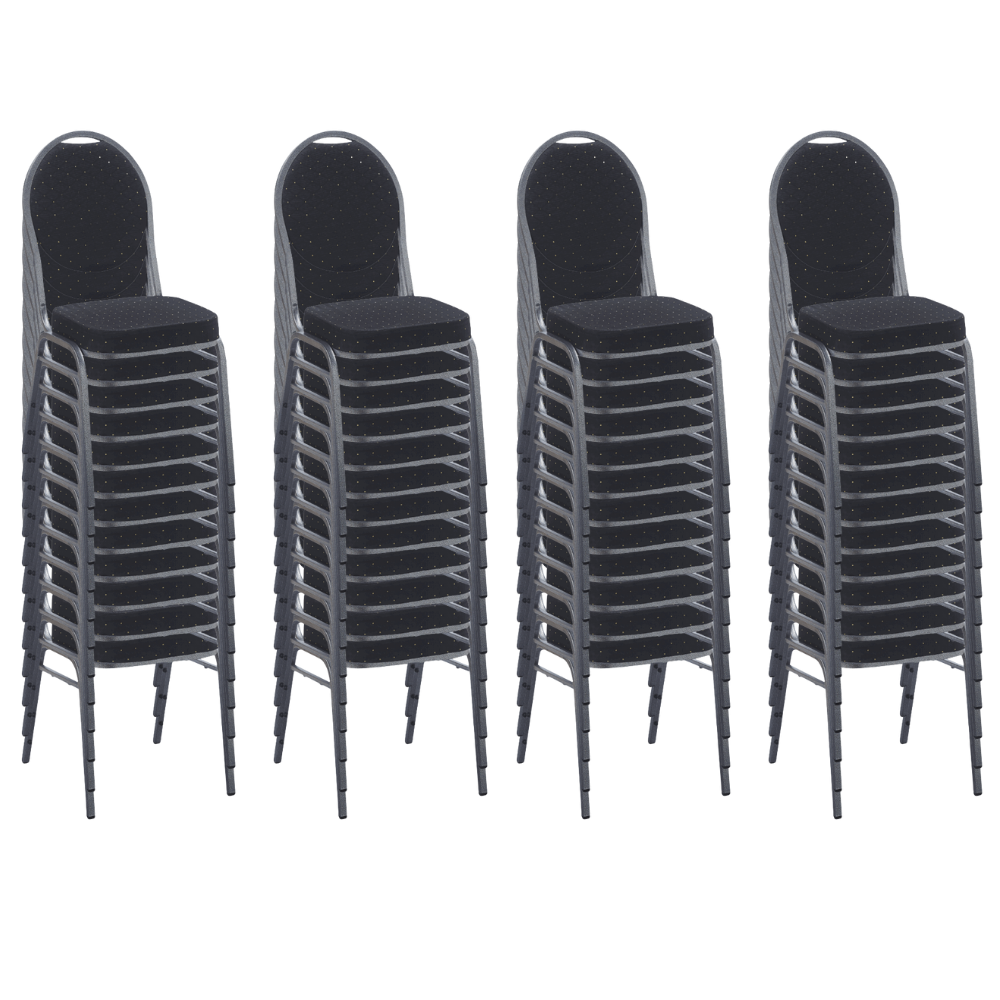 Der Bankettstuhl Hermano in Schwarz kombiniert zeitloses Design mit langlebiger Qualität – ideal für Konferenzen, Bankette oder Veranstaltungen. Das schwarze Polster und das pulverbeschichtete Stahlgestell sorgen für eine professionelle Optik im Raum. Lieferung erfolgt als praktisches 50er Set.