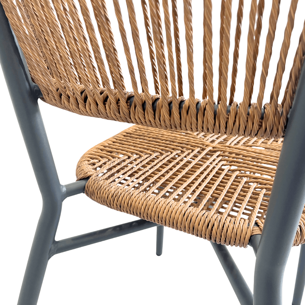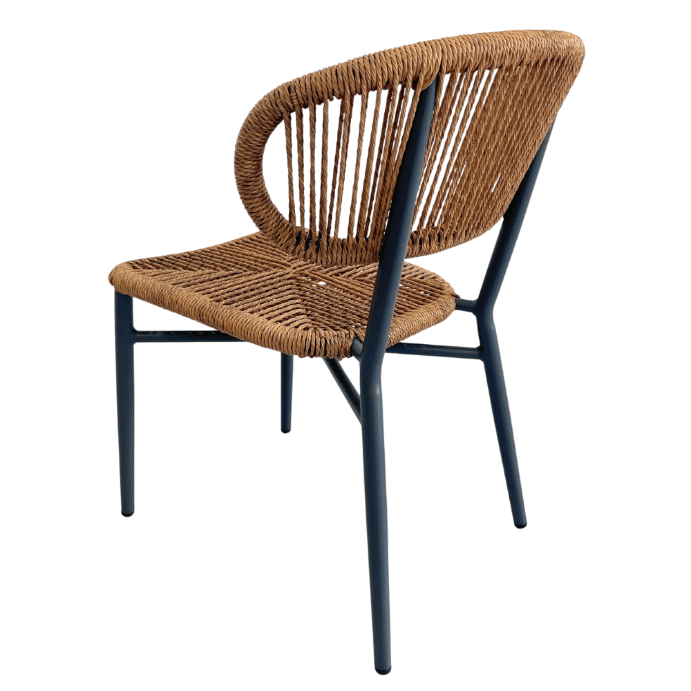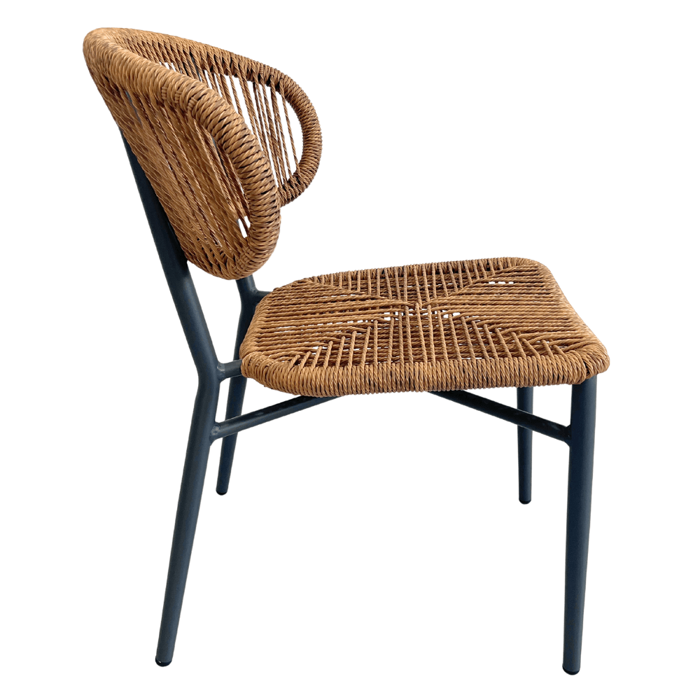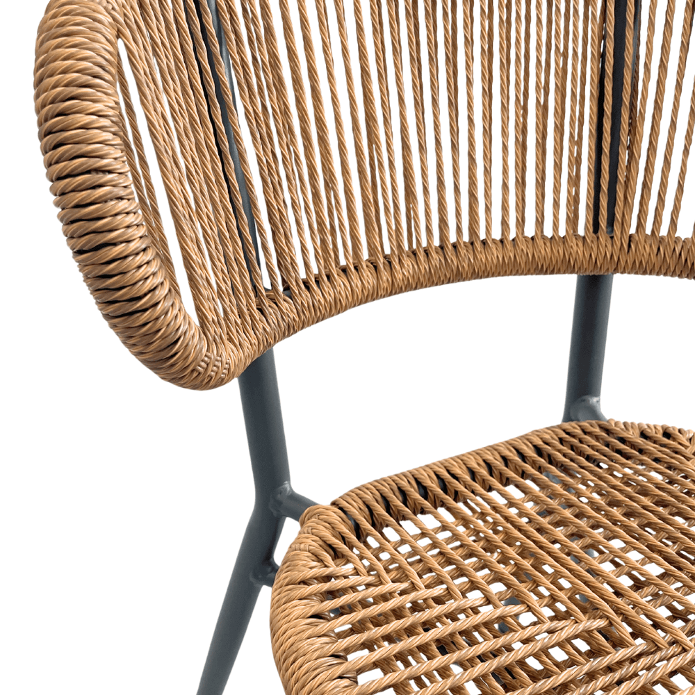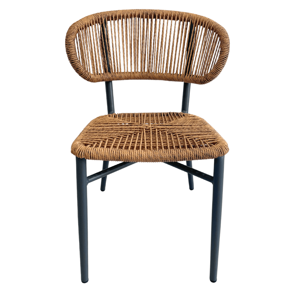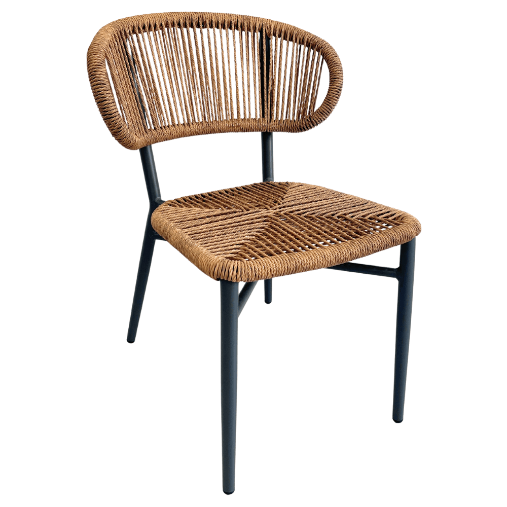 Der Terrassenstuhl Riva Honey ist ein stapelbarer Gastro- und Caféstuhl aus Aluminium mit rund geflochtenem PE-Rattan – leicht, robust und pflegeleicht für den Outdoor-Einsatz.